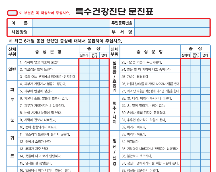 - 검진 기관: 고용노동부 지정 특수건강진단기관에서만 가능