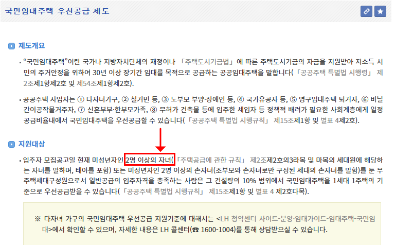 - 공공임대주택 공급 시 2자녀 이상 가구에 우선 배정