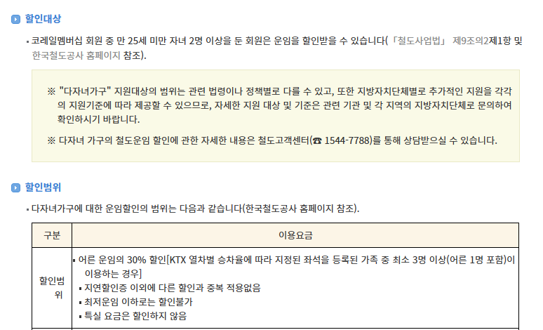 - 철도 운임 할인: 코레일 다자녀 할인, 최대 30%