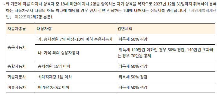 - 2자녀 이상 가구가 7~10인승 승용차 구입 시 취득세 감면