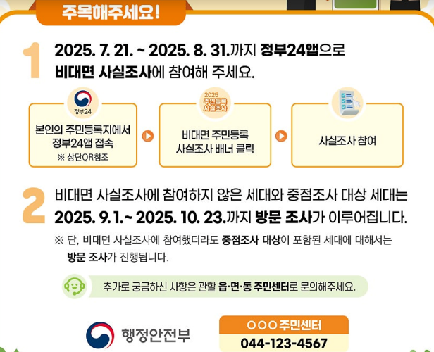 2025 주민등록 사실조사 최신 절차와 참여 방법 정리. 정부24 앱 비대면 조사, 방문 조사 대상, 과태료 및 불이익까지 한눈에 확인하세요.