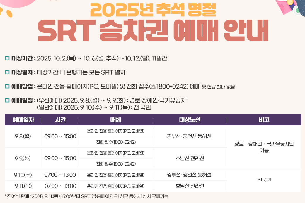 - 잔여석 판매 : 9월 11일(목) 15:00 이후 앱·홈페이지·역 창구에서 가능