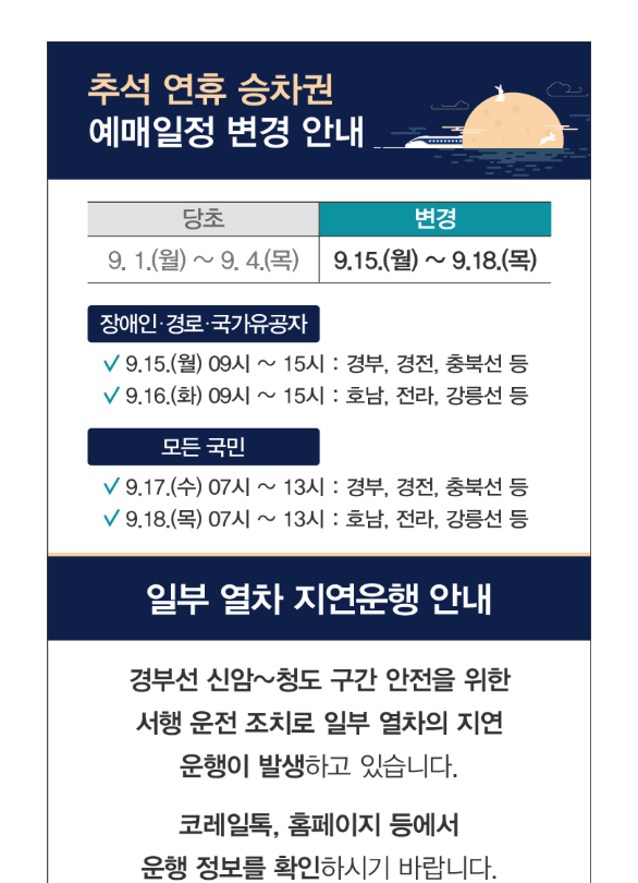 👉 올해 코레일 예매 일정은 당초 9월 14일에서 9월 15-18일로 변경되었으니 반드시 확인하세요.