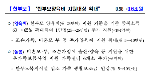 - 대상 확대: 약 1만 명의 한부모 가정이 추가로 혜택을 받게 됨