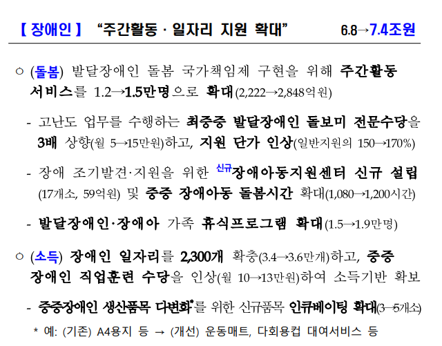 - 취약계층: 기초생활보장, 장애인·한부모 지원 강화