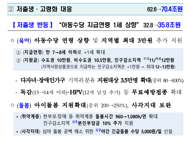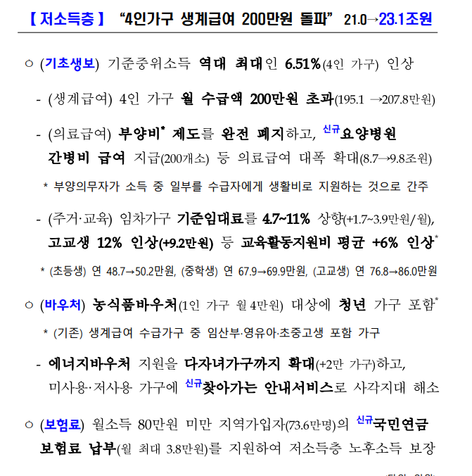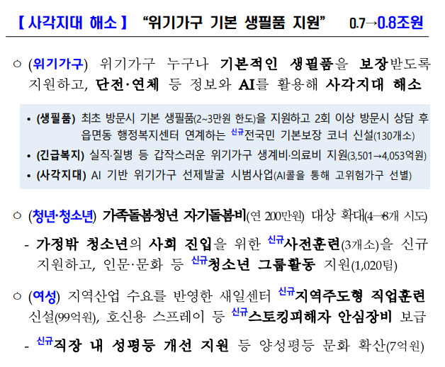 - 기초생활보장: 기준중위소득 6.51% 인상 → 4인 가구 생계급여 207.8만원