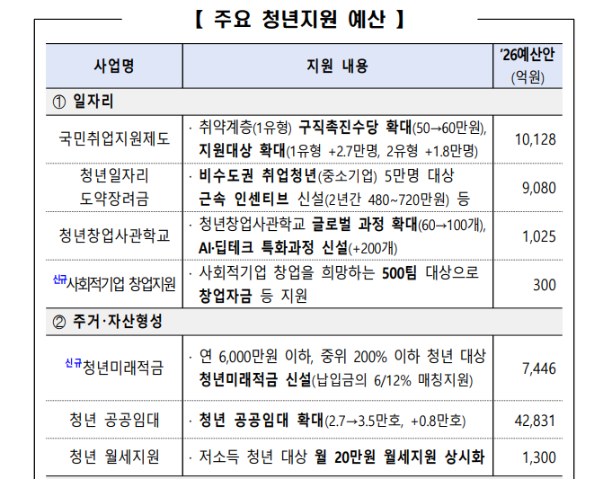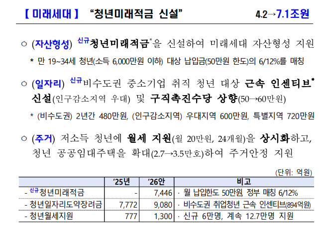 - 청년: 미래적금, 월세 지원, 임대주택 확대, 구직지원