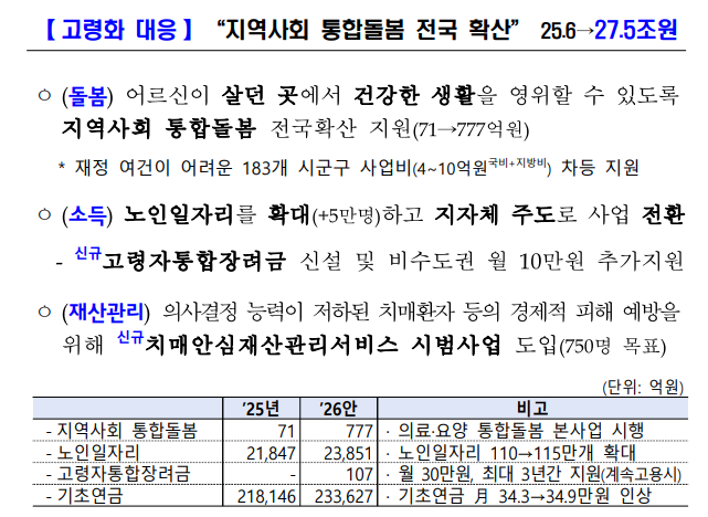| 기초연금 | 월 34.3만원 → 34.9만원 | 소득 보장 강화 |